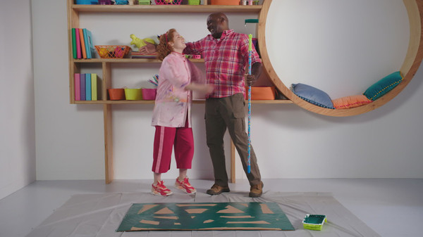 Passe-Carreau et Fardoche créent une toile de grandes dimensions inspirée de «Confrontation», de Suzanne Meloche. Ils peignent au rouleau, avec divers grands gestes. Les enfants aimeraient sans doute aussi peindre ainsi, avec de grands mouvements!