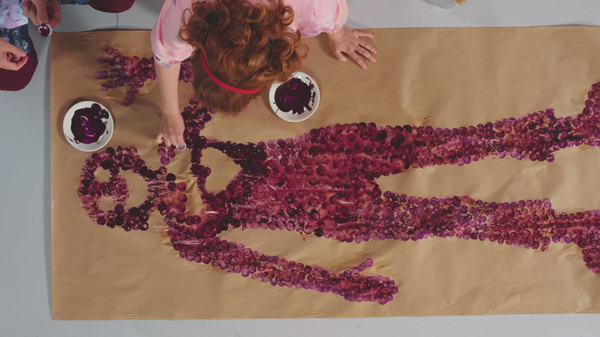 L'oeuvre «Grand visage» donne envie à Passe-Carreau de peindre un grand bonhomme à la manière de Maryse Bouthillier avec Passe-Montagne. L'eau transforme leurs empreintes de peinture. Les enfants sont invités à essayer cette technique fascinante!
