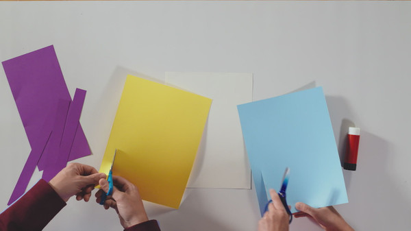 Après avoir vu l'oeuvre «Mutation bi-sérielle grise», de Guido Molinari, Passe-Partout s'en inspire pour faire, avec l'aide de Passe-Montagne, un collage tricolore de bandes de carton qui se répètent. Elle invite les enfants à essayer à leur tour.